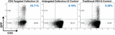 Un-activated PBMCs were efficiently transduced with Cellective LVs targeted with the CD3 Targeting Adapter, but not with untargeted Cellective LV control. Transduction efficiency with CD3-targeted Cellective LV was 3-fold higher than with a traditional VSV-G LV.
