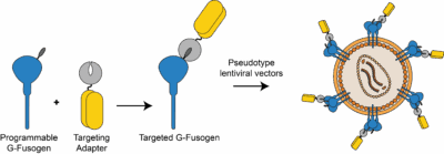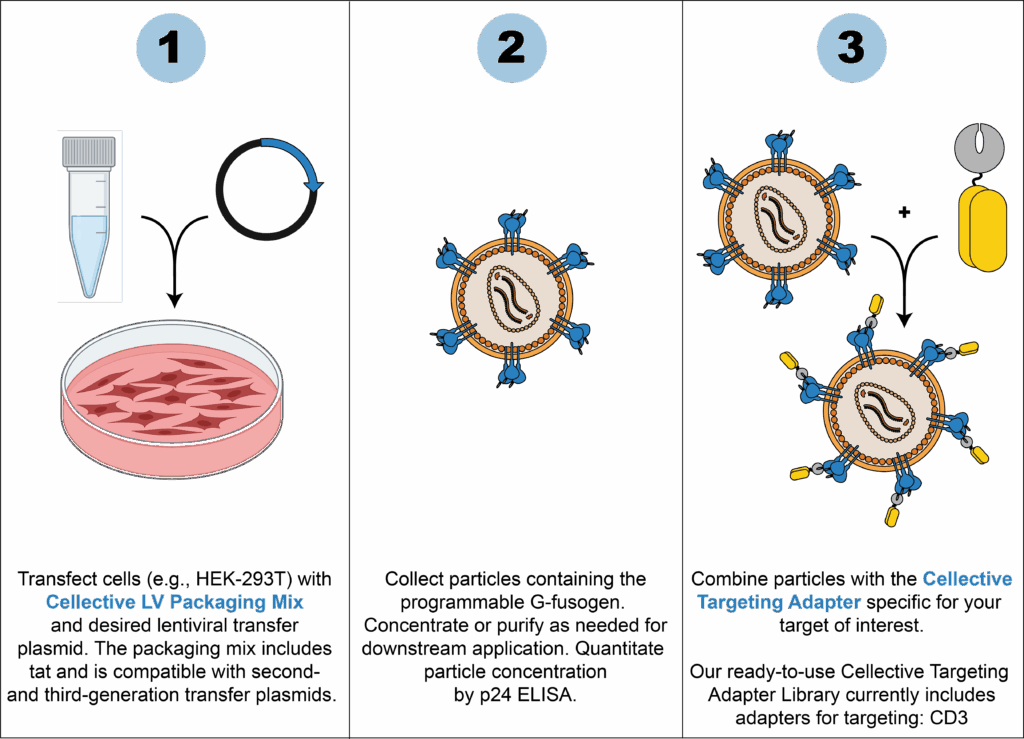 Cellective reagents enable manufacture of lentiviral vectors targeted to user-selected cellular receptors. The modular system is comprised of a programmable G-fusogen, which is used to pseudotype LVs, and targeting adapters, which covalently bind and program the G-fusogen to specific cellular receptors. Targeting adapters are currently available for targeting CD3 on T cells.